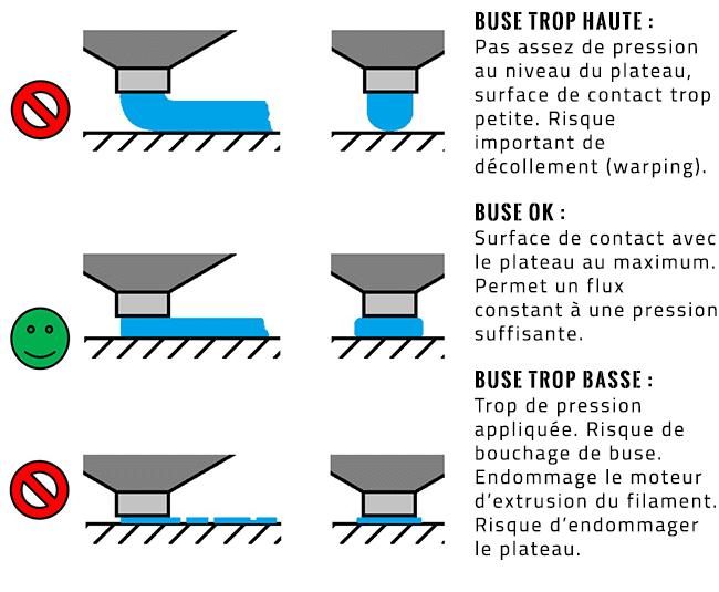 - – Si le plateau est trop haut, le plastique extrudé va chasser sur les côtés de la buse. La buse va labourer à travers le plastique et laisser une première couche qui est trop mince.