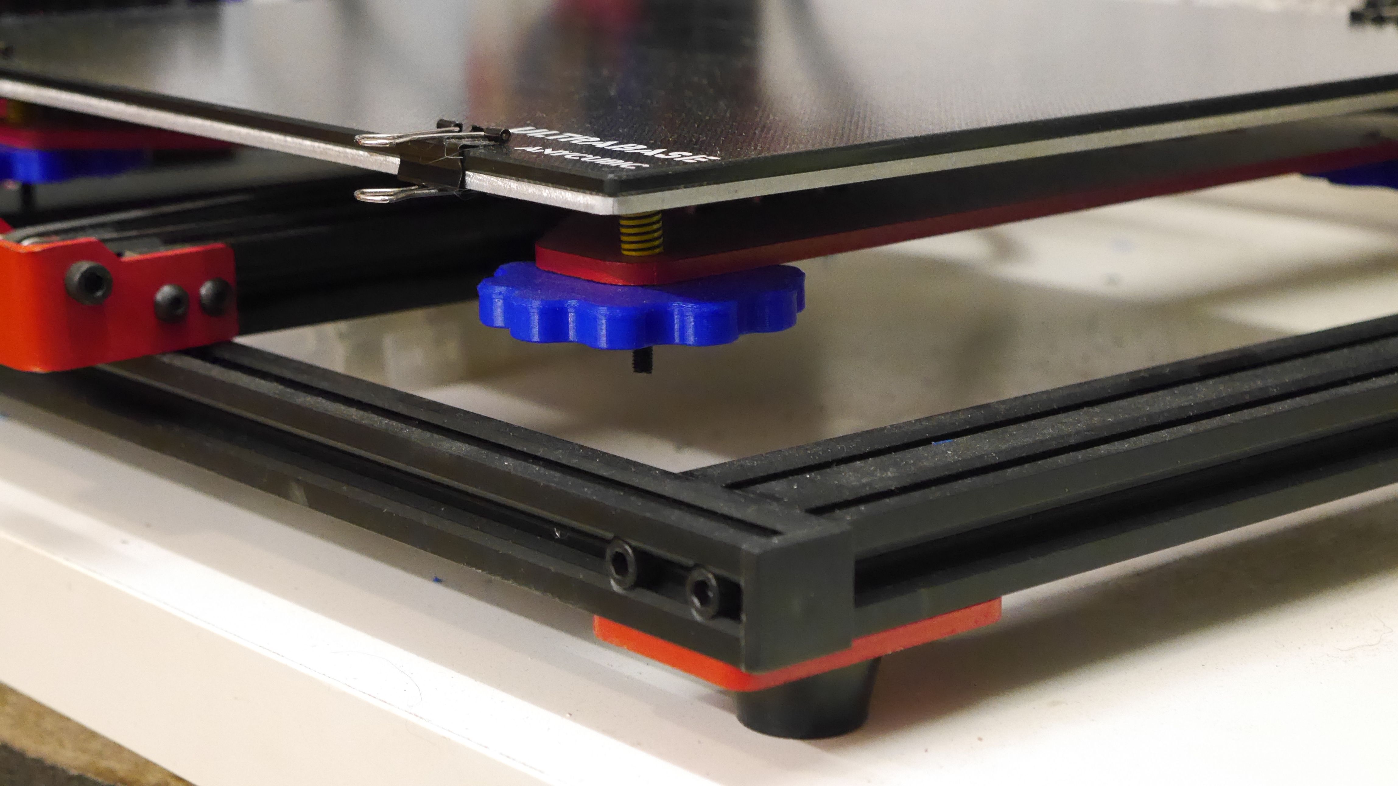 - – Vous pouvez essayer d’ajuster soigneusement les molettes pendant la première couche de l’impression pendant que la plaque se déplace jusqu’à ce que la distance entre la plaque de construction et la buse produise des lignes extrudées lisses. Faites attention aux pièces mobiles pour ne pas être pincé.