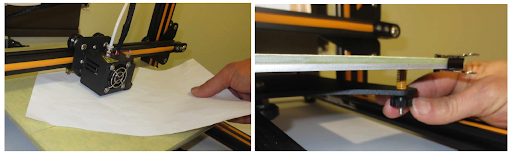 Pour imprimer correctement vos pièces, la plaque d’impression doit être de niveau et la buse doit être à environ 0,1-0,2 mm de la plaque à tous les emplacements. Si vous avez une surface d’impression LokBuild, nous recommandons une distance de 0,20-0,25 mm. Il s’agit de l’épaisseur de deux morceaux de papier (ou d’un pliée en deux pour doubler son épaisseur). Si vous utilisez une de la laque ou de la colle comme surface d’impression, nous recommandons une distance de 0,1 mm. C’est à peu près l’épaisseur d’un seul morceau de papier. Vous voulez ajuster la hauteur de la plaque de construction de sorte que vous puissiez à peine glisser le papier entre la buse et la plaque de construction avec seulement une petite résistance.